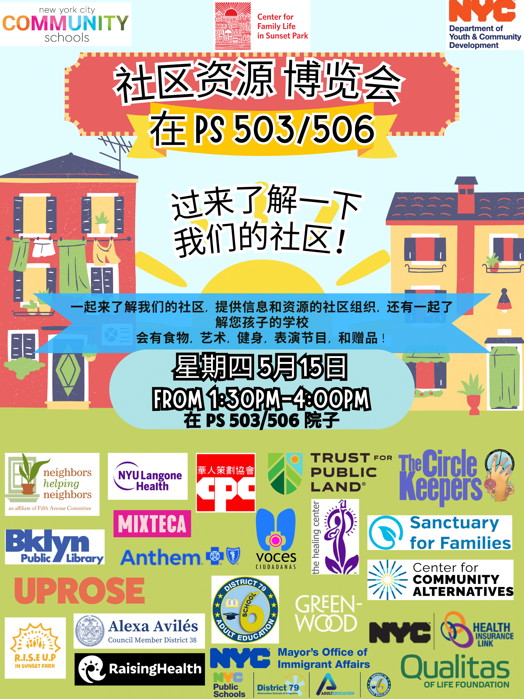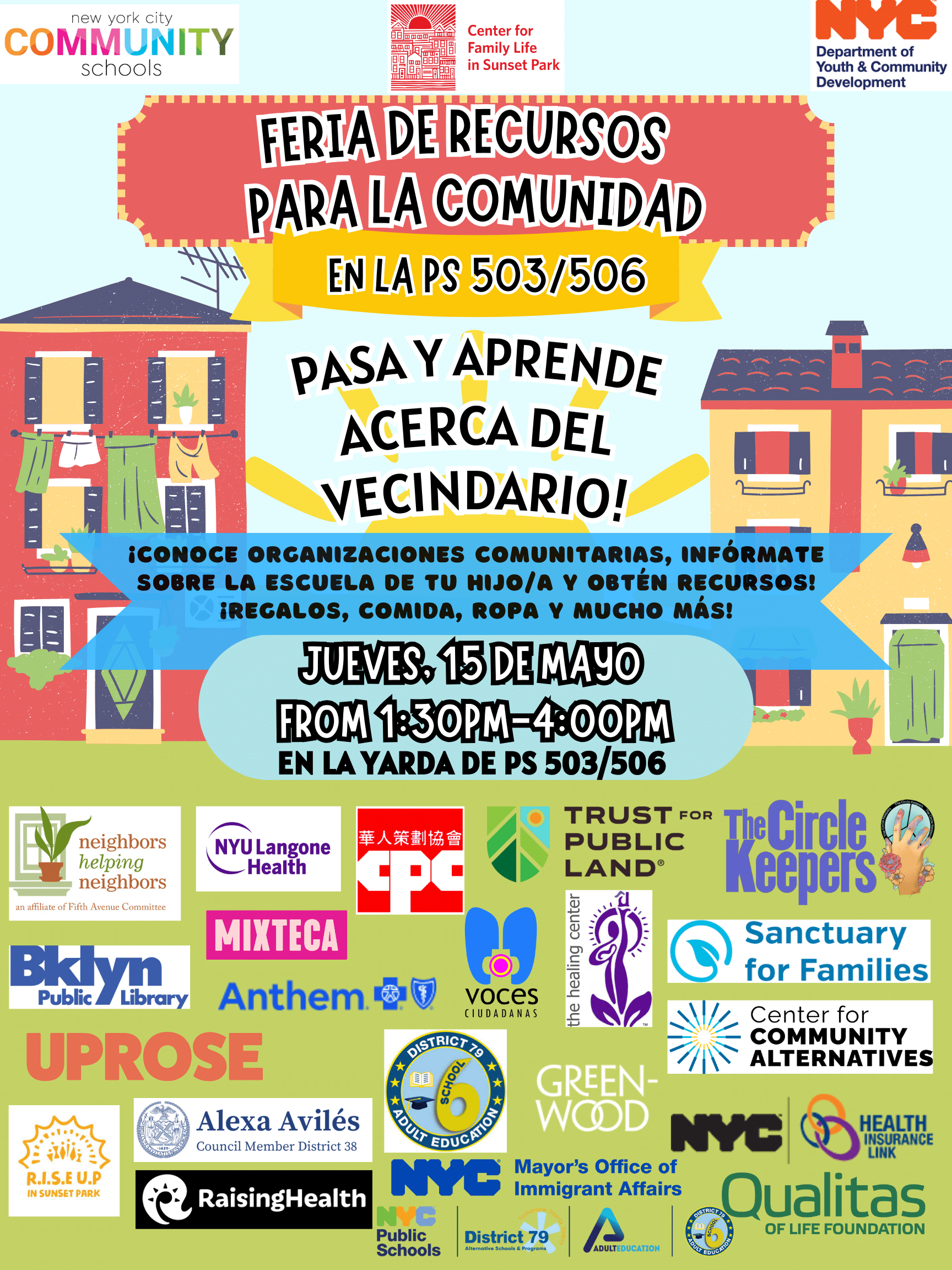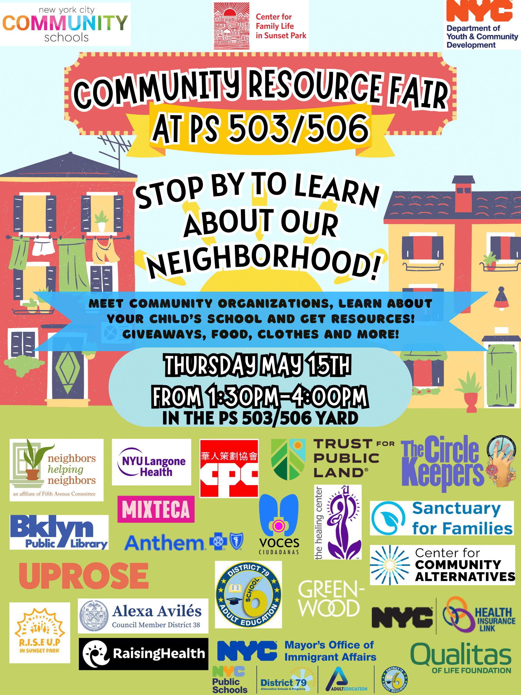 Join us on Thursday, May 15th at PS 503/506 from 1:30-4:00pm for a Community Resource Fair here in Sunset Park!